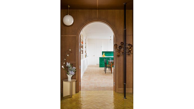 The design of the entrance hall revolved around arch-shaped wood panels, used to separate two different parts of the house. One part is the kitchen-diner, inspired by things typical of Mexico and clad in emerald green tiles. The other part is made up of the terraces and living room, inspired by Singapore. White and yellow tiles were used in the latter, where they make even more of an impression when exposed to direct sunlight.