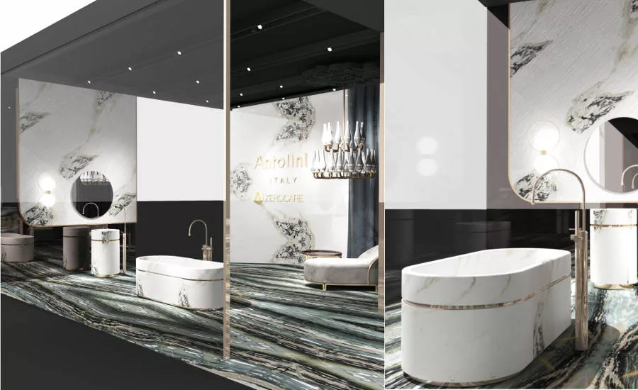 At the 2019 edition of the ISH event in Frankfurt, Antolini will present an evocative display that combines boldness and grace, ethereal airiness and expressive power. Custom made by designer Alessandro La Spada, the exhibition space opens up like a luminous stage where the elegant character of natural stone creates surprising scenographic backdrops from which unique pieces of unmistakable personality emerge.