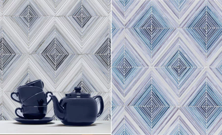 Artistic Tile recently introduced Echo mosaic tile collection. Thin strips of colorful Jazz Glass encircle the center of each glass diamond that composes Echo, reducing in color as they form a spectrum from center to edge. The gradient effect repeats across the surface of the pattern, creating an overall consistency that complements the detailed complexity internal to each diamond.