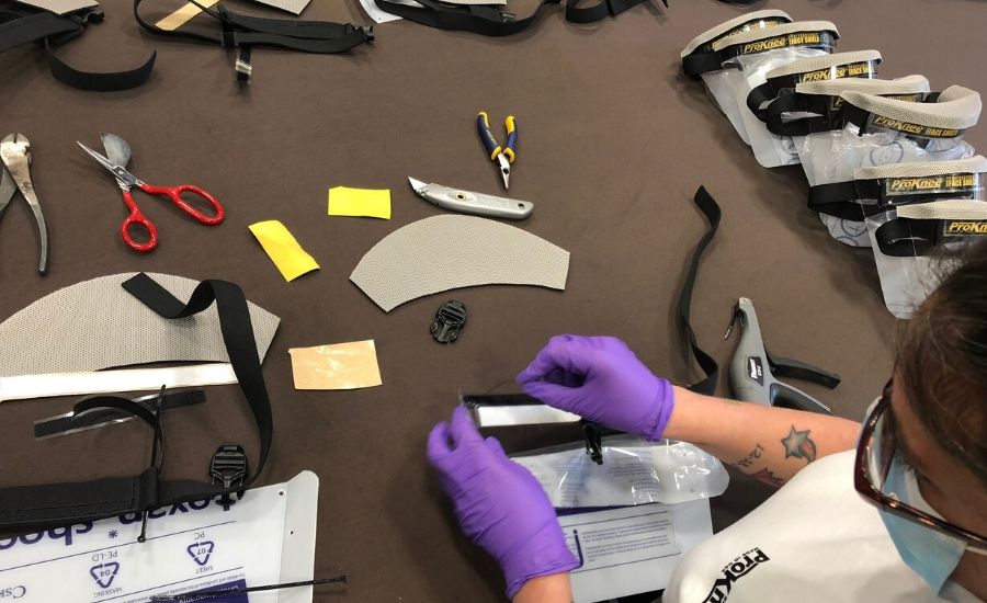 The problem is layered, with not only limited PPE available on the global market, but also limited resources available across the country to produce said PPE. After assessing its current inventory of parts for the Model 0714/0714E custom fit and AP16 All Purpose Kneepads, ProKnee sprang into action producing face shields. “After securing a large batch of Lexan Polycarbonate sheets, I knew we had everything we needed to get started right away on a superior, reusable face shield,” says Lee Richards, founder of ProKnee Corp. After 31 years of customer feedback and actual field testing of materials developed for direct skin contact, ProKnee’s specialized materials were perfectly suited for the task at hand. ProKnee’s face shield utilizes their soft poly woven elastic straps from both of our kneepad models, 0714 and AP16, as well as our wick-tech liner fabric, which is serving as an optional detachable wick guard/sweat band for added comfort and protection overhead. Additionally, the shield uses ProKnee’s proprietary Smartlock buckle to lock in the desired strap length for a secure and adjustable custom fit around the wearer’s head. The 8” long shield, made of durable polycarbonate, provides crystal clear optics and fits over glasses and masks.