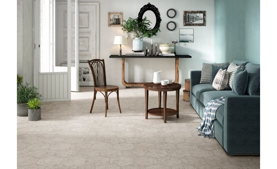 Crafted in Spain, Teigen’s large-format design–available in a 24”x24” square field tile, a 10” hexagon, and complementing 3”x24” Bull Nose–is sold by the box with additional sizes available by custom order. The in-stock collection is offered in black, grey and white, the matte surface sprinkled with tiny white, caramel, grey and black stones in textural contrast.