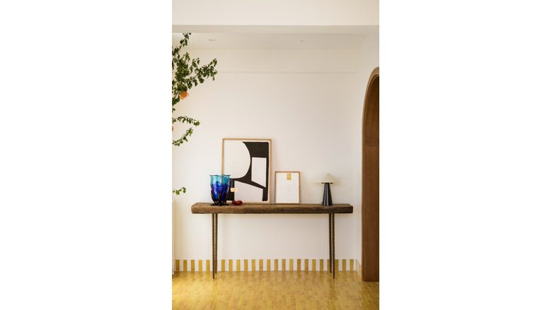 The design of the entrance hall revolved around arch-shaped wood panels, used to separate two different parts of the house. One part is the kitchen-diner, inspired by things typical of Mexico and clad in emerald green tiles. The other part is made up of the terraces and living room, inspired by Singapore. White and yellow tiles were used in the latter, where they make even more of an impression when exposed to direct sunlight.