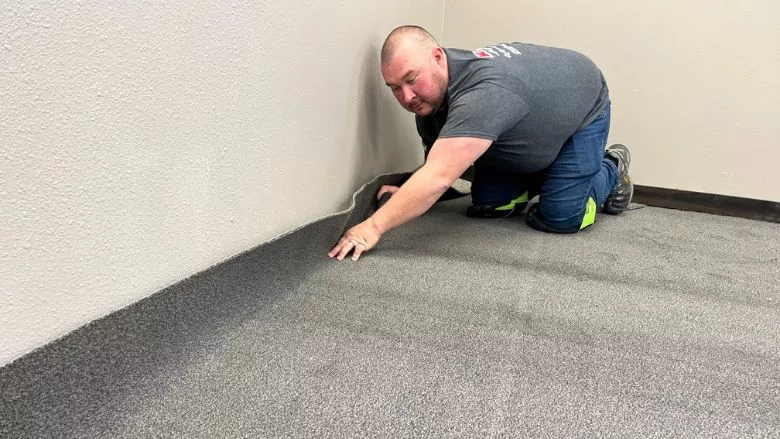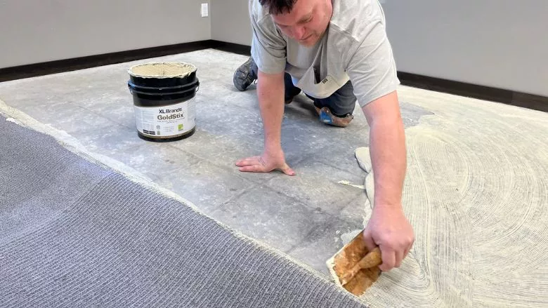 Casey Peterson spreading XL Brands GoldStix carpet glue. Photo: John Steier.