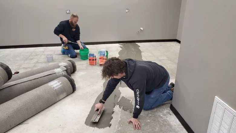 Casey Peterson and Tyler Garmen spread adhesive in the soon-to-be workout room as Kyle Koenecke supervises from what will be the kitchenette area. Photo: John Steier.