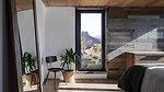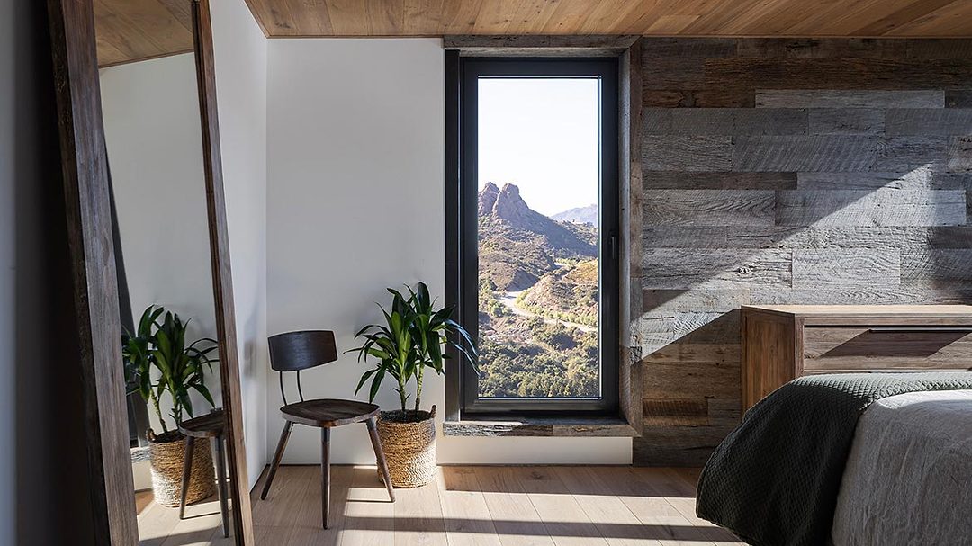 The primary bedroom, with its panoramic views, seamlessly connects to the lower level through the reclaimed oak wall paneling, creating a cohesive design narrative.