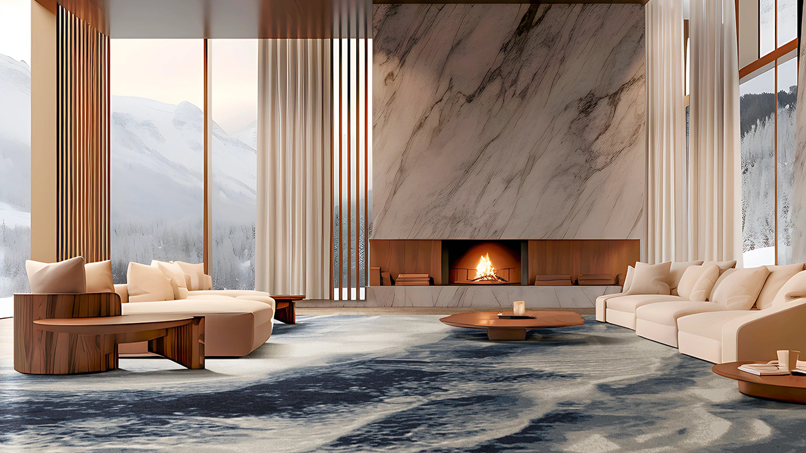 Research also shows that it is easier for brains to visually process patterns and shapes found in nature, like Shaw Contract’s (1014) Arctic Escape––a collection of rugs and broadloom inspired by the frost-covered and icy landscapes of the polar tundra. Similar studies suggest that warm colors––like Pantone’s color of the year, Peach Fuzz––are associated with feelings of joy, while cool colors correlate with feelings of calm and contentment. The American Society of Interior Designers (ASID)’s 2024 Trends Outlook notes that blue hues are becoming the dominant accent colors––from dusty and steely tones like Sherwin-Williams’ (163) Upward, to bold and bright hues like Benjamin Moore’s (6-131, 7-4054) Blue Nova. This shift may signify a collective longing for clarity, purity, and increased intuition, all reactions to the color blue as prescribed by color theorists. Bernhardt’s (320) new Ice Collection of tables includes a striking cobalt blue.