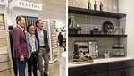Left: The Stanton executive team attended the grand opening of America's Floor Source in Columbus, Ohio. Right: Residential displays in the America's Floor Source showroom showcase the latest tile trends. Photos: America's Floor Source.