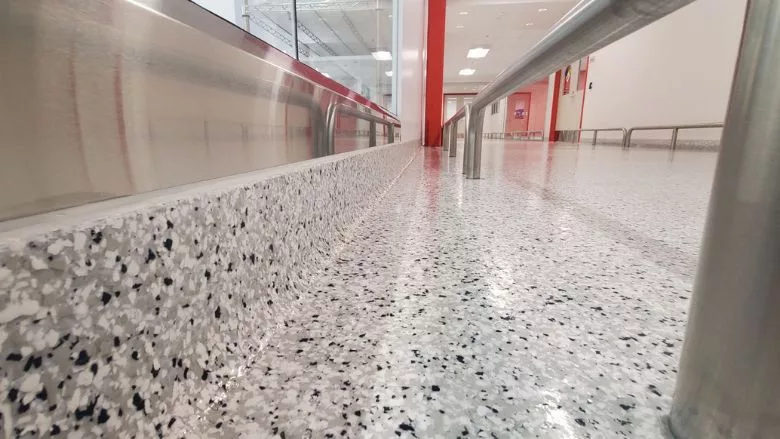 Hybri-Flex AQ One – A 3/16- to 1/4-inch-thick system that includes a highly moisture-resistant, self-priming and self-leveling body coat. It is topped with a double broadcast of decorative Q28 or Q11 quartz aggregate and finished with a clear grout coat and a topcoat of Accelera One. This system is perfect for areas with concrete moisture concerns, as well as cleanrooms, dry rooms, research, production and other high-use spaces.