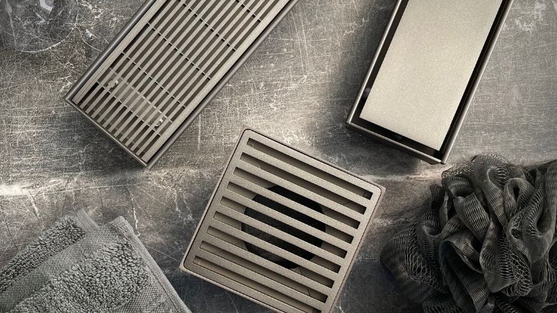 Darker-toned faucets, shower heads, drains and more pair beautifully with a lighter palette on the walls and floors. Photo: Infinity Drain.