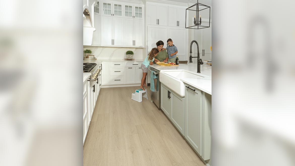 Tarkett Home’s ShoreFlor laminate features superior waterproof technology specifically engineered for moisture-prone rooms in the home, like kitchens and bathrooms. Featuring a hydrophobic coating on the beveled edge, this innovative technology effectively repels water. Additionally, ShoreFlor’s watertight locking system prevents any water from reaching the core, maintaining the integrity and appearance of the floor. This robust combination of features provides exceptional long-lasting performance and protection against spills and splashes.