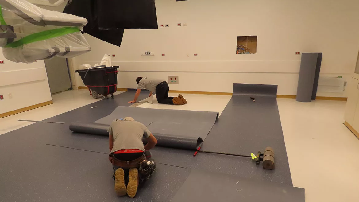 Installing flooring in a hospital setting.