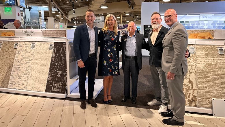 The Nebraska Furniture Mart and Shaw teams at the opening of the Anso Gallery in Kansas City, Missouri. From left: Benjamin Liebert, executive vice president of residential business at Shaw Industries; Elizabeth Hurley, VP residential and retail accounts, Shaw Industries; Irv Blumkin, chairman of Nebraska Furniture Mart; Dave Chambers, flooring director, Nebraska Furniture Mart; and Tony Boldt, president and CEO of Nebraska Furniture Mart. Photo: Floor Trends & Installation.