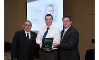 Dan Rea, left, MIA's president and sponsor of the 2014 Scholarship Award and Tony Malisani, right, MIA's 2014 president, presenting the 2014 MIA Natural Stone Scholarship Award to Stephen Beck.