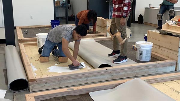 During week three of the 10-week Basic Flooring Installation Program, Joe Cea, technical specialist, Congoleum, worked with the students, giving them tips and tricks on installing resilient flooring donated by Congoleum.