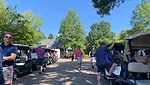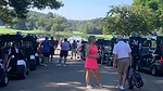 Golfers ready their carts to hit the course.